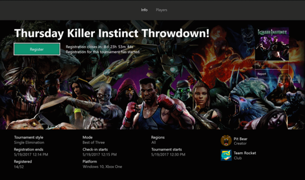 También se incluirá la función de crear torneos de Killer Instinct a traves de Arena para tus Xbox Live Club. Estos los podrás crear directamente en el apartado de Clubes en tu App de Xbox de PC o dispositivo móvil. Aquí podrás crearlos y personalizarlos para que los miembros del club participen.